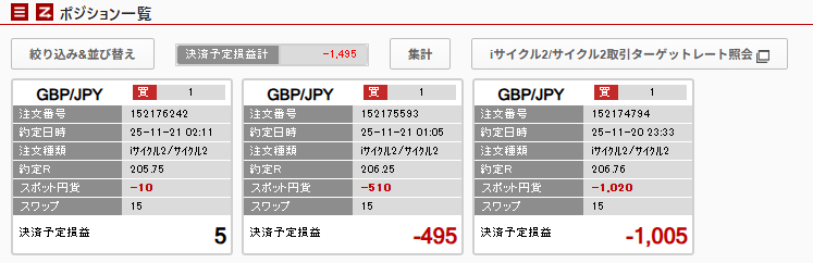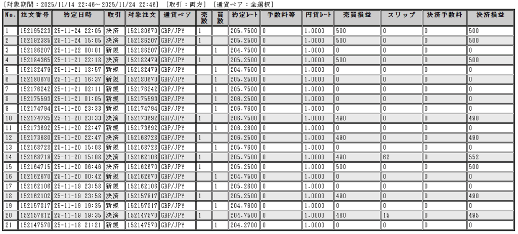 2025/11/24現在の損益状況(2025/11/18~の累積)だいたい23時くらい