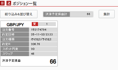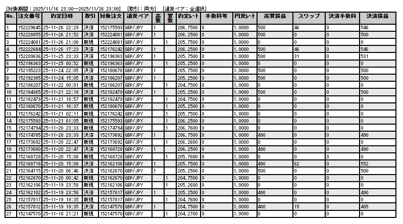 2025/11/26現在の損益状況(2025/11/18~の累積) だいたい23時くらい