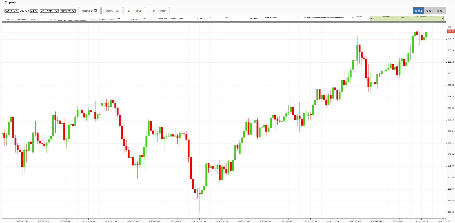 上のチャートは自動売買で回しているチャートと同じポンド/円の4時間足です。