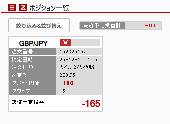 未決済ポジションは1件、含み損が-165円です。
