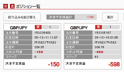 現在のポジション 未決済ポジションは2件、含み損は-748円です。