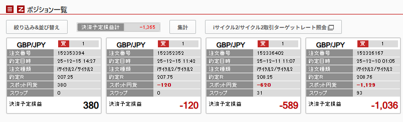 現在のポジション 未決済ポジションは4件で、含み損はいまのところ-1365円です。