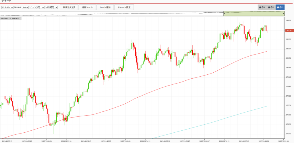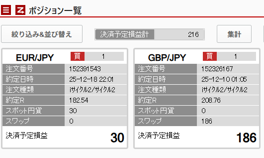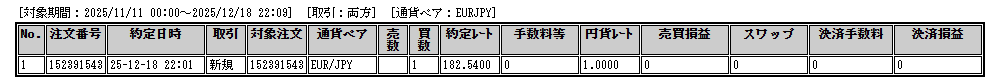 ユーロ円(2025/12/18開始):新規1件、未決済ポジション1件