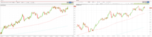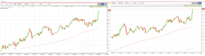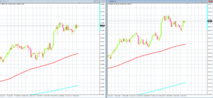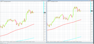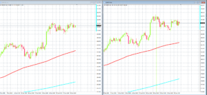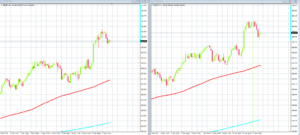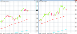上のチャートは「ポンド/円」と「ユーロ/円」の5分足です。さきほど急落があったので、5分足を載せてみました。