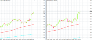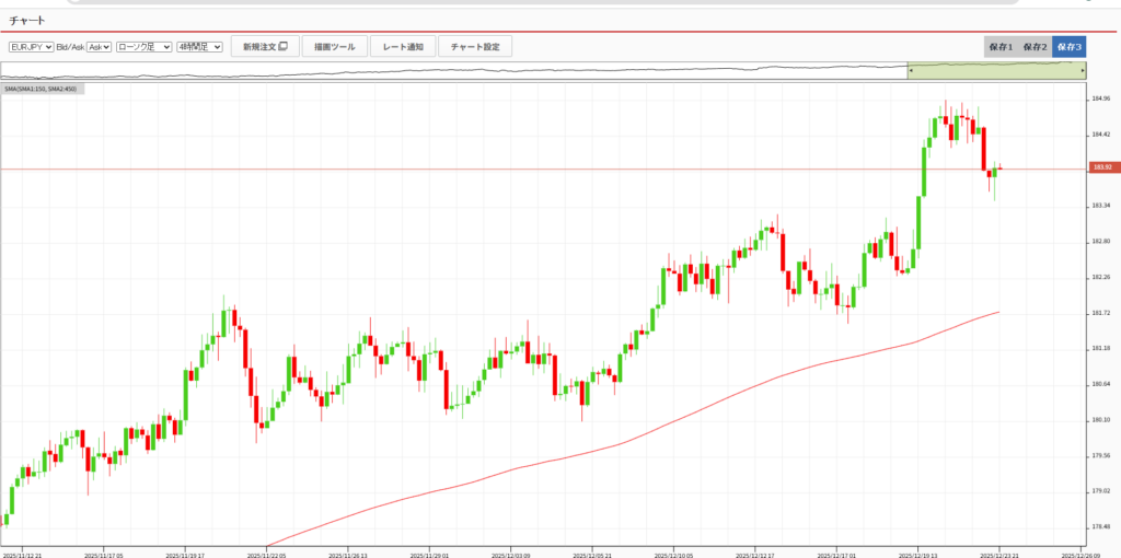上のチャートは自動売買で稼働させているのと同じ「ポンド/円」と「ユーロ円」の4時間足です。チャートには移動平均線(SMA)の150(赤線)と450(水色線)を追加しています。自動売買の設定画面に『トレンド判断テクニカル』という記載があったので反映しています。