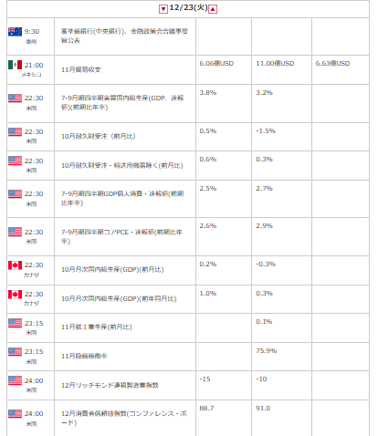 今夜12月23日(火)は、アメリカの重要な経済指標が目白押しです。