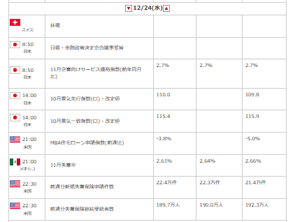 クリスマスイブなので、重要度の高い指標発表は予定されていません。欧米の市場も休場や短縮取引が多いため、今夜は為替レートが大きく動く材料は少なそうです。