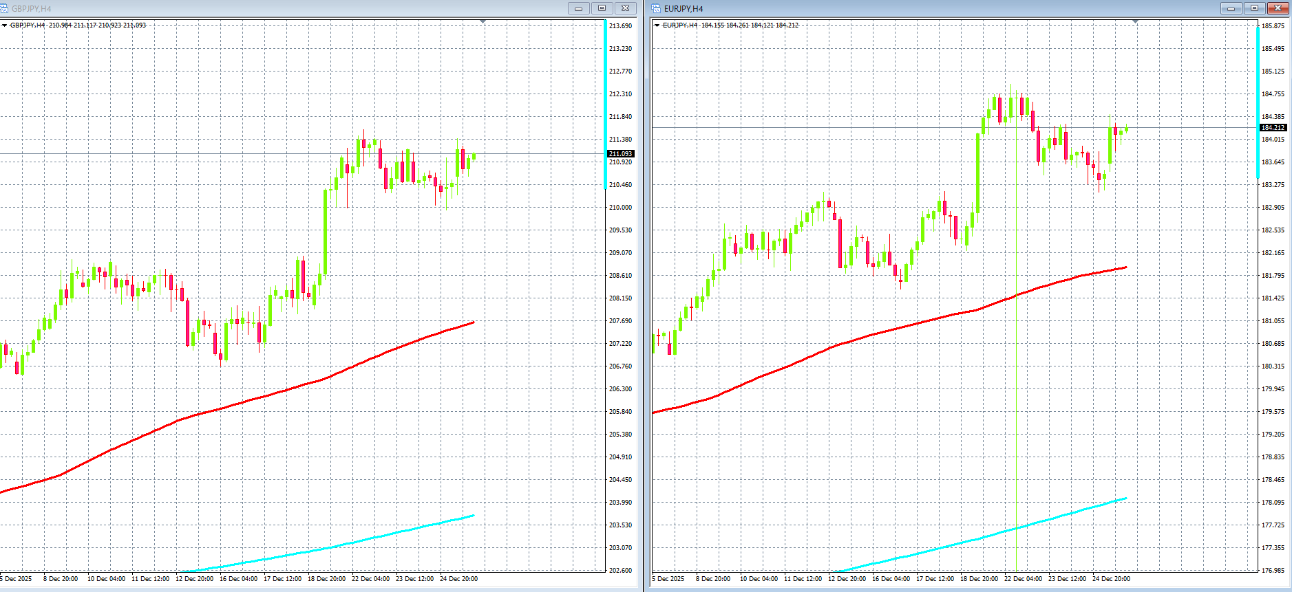 今日のポンド円・ユーロ円チャートは、ボクシング・デーでイギリスやカナダといった主要市場が休場ということもあり、非常に穏やかな動きになっています。昨日の投稿時の含み損は、今は少しですがプラスに転じています♪