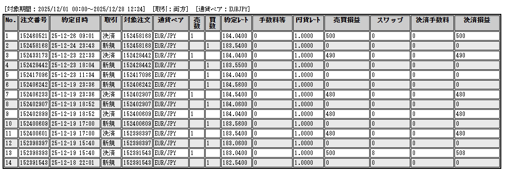 トレード履歴詳細ユーロ円(実際のスクショ):(2025年12月分)