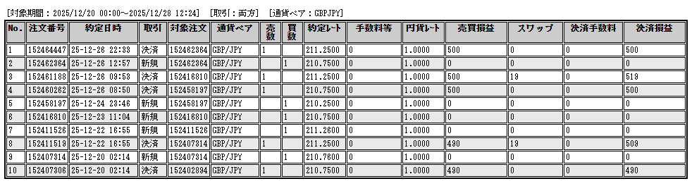 トレード履歴詳細ポンド円(実際のスクショ):(2025年12月分)以前の記録は過去記事をご覧ください。多いので2枚になってます。
