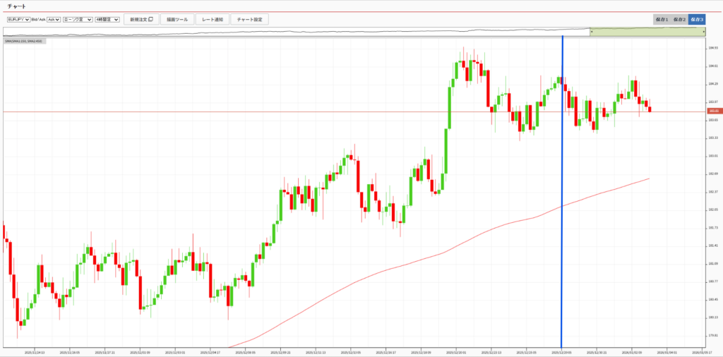 青い縦線から右側(今週の動き)は、高値圏での「ヨコヨコ(もみ合い)」になりました。年末年始で取引する人が少ない時期だったので、大きな動きこそありませんでしたが、「下がらなかった」というのが強さの証拠だと思います。 iサイクル2にとっては、この「崩れそうで崩れない、適度な上下」が一番の稼ぎ時。おかげで約100ピプスの利益をコツコツ積み上げてくれました。