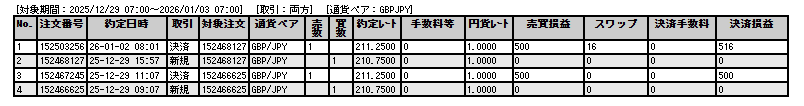 トレード履歴詳細ポンド円(実際のスクショ):(2025年12月29日の週のみ)以前の記録は過去記事をご覧ください。