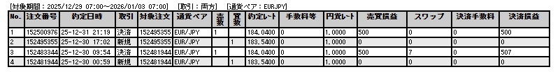 トレード履歴詳細ユーロ円(実際のスクショ):(2025年12月29日の週のみ)以前の記録は過去記事をご覧ください。