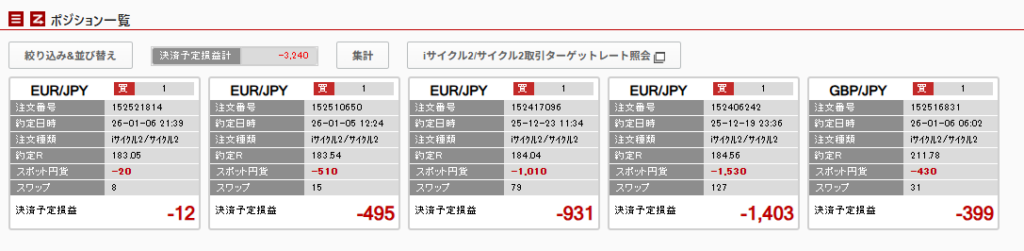 こちらは動きがありました!以前のポジションが戻ったところで『決済』、下がったところで『新規』が入って…というiサイクルの強みが出た形に見えます。含み損は依然として4件ありますが…(^-^;