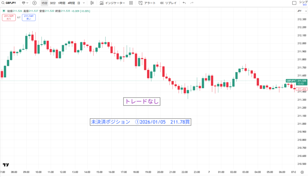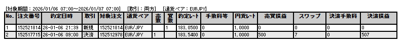 1/6は『待ち』の一日でしたね。自動売買だと、こういう動かない日に焦って変な操作をしなくて済むのが良いところかもしれません。未決済ポジションもスワップがつきますしね♪