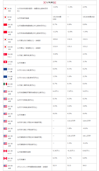 2026年1月9日(金)のカレンダー*外為オンラインからの引用