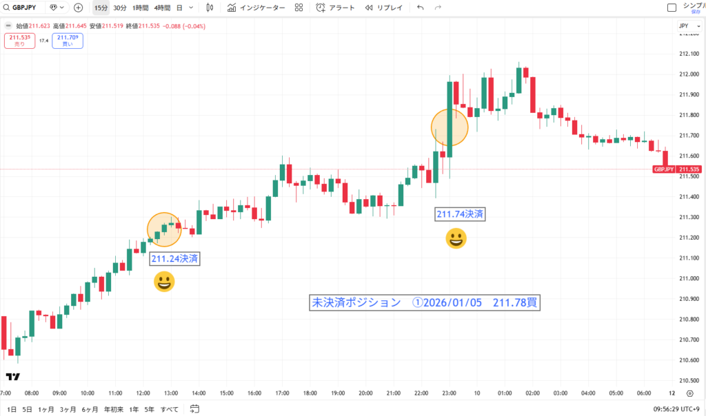 ポンド円は、朝方から右肩上がりの強い動きを見せてくれました。チャート上のニコちゃんマークの通り、上昇の波に乗って2つのポジションが利益確定(決済)されています! 以前から持っていたポジションが整理され、チャートがスッキリしていくのは見ていて気持ちがいいですね。