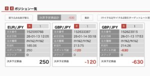 未決済ポジション一覧 ユーロ円1件、ポンド円2件ですね!