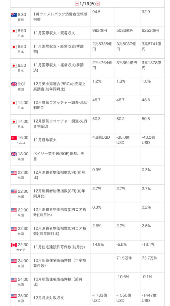 2026年1月13日(火)のカレンダー*外為オンラインからの引用