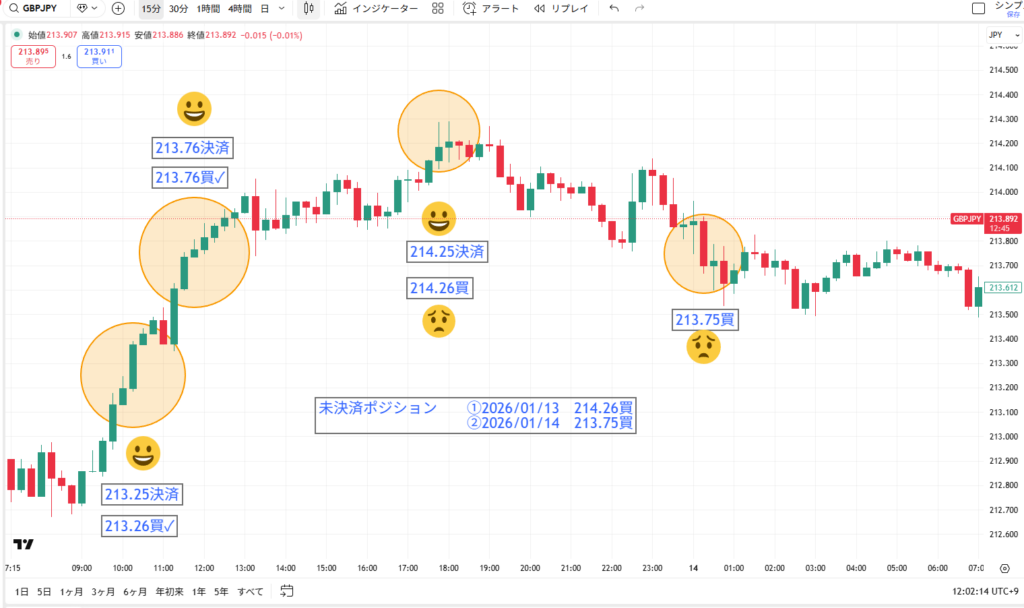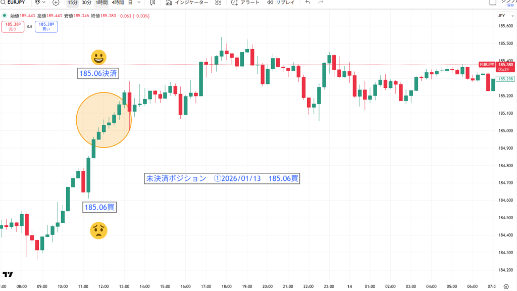 こちらも順調そうです。昨年末からのポジションもこの上昇の波に乗って無事に決済されました!チャート上の「決済」マークを見るとホッとしますね(^^)。