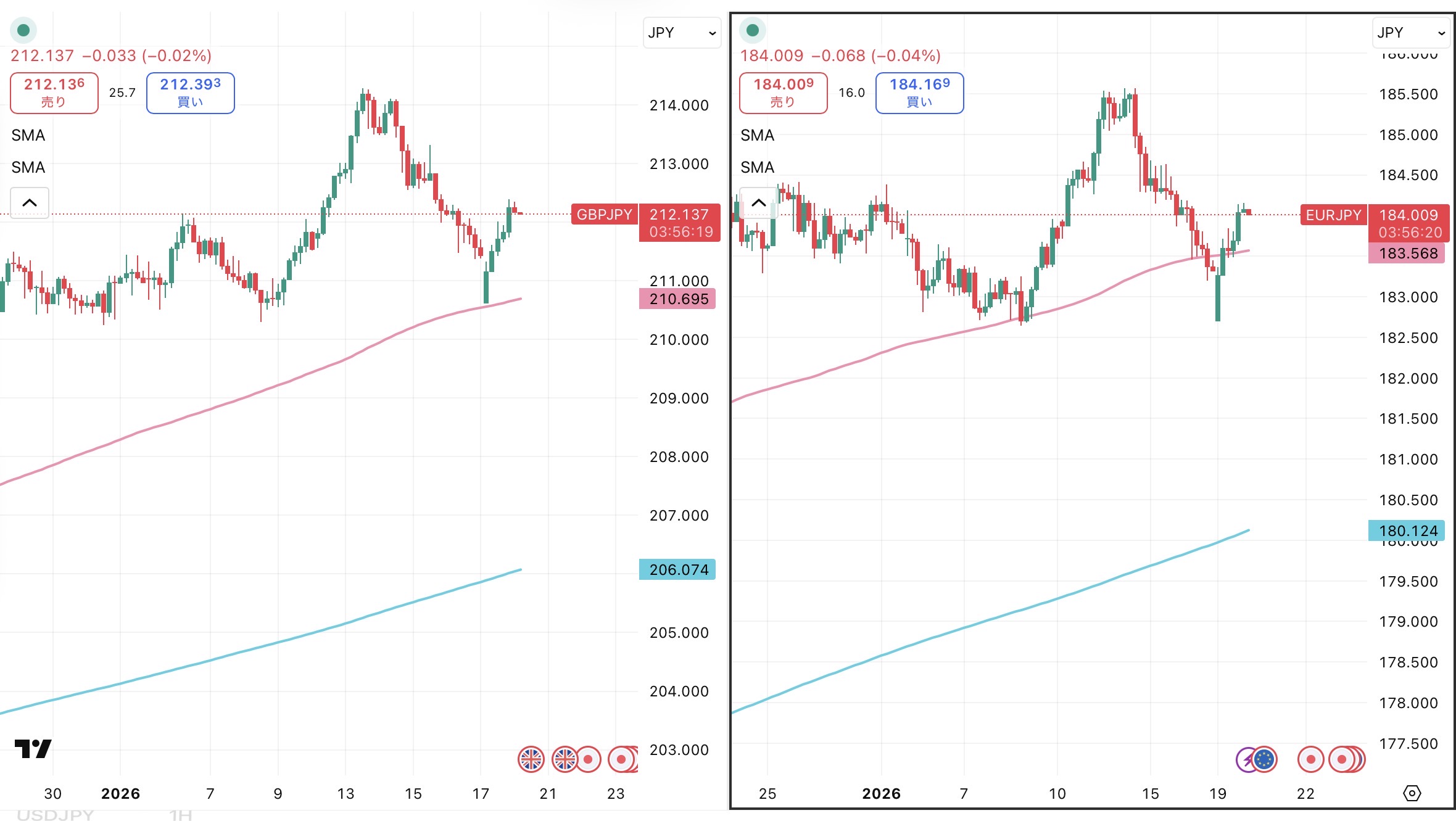 上のアイキャッチ画像のチャートは左がポンド円、右がユーロ円の4時間足です。「iサイクル2」トレンド判断テクニカルの150SMA(ピンクの線)、450SMA(水色の線)を反映させています。