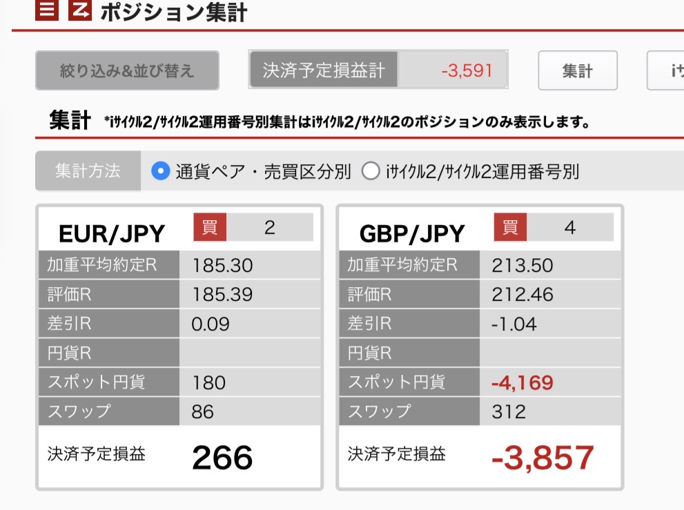 今の未決済ポジション(含み損)は、ユーロ円が2つ、ポンド円が4つです。前回よりポジションが減って、少し身軽になりました。含み損が減るとやっぱり精神的に楽ですね(^-^)