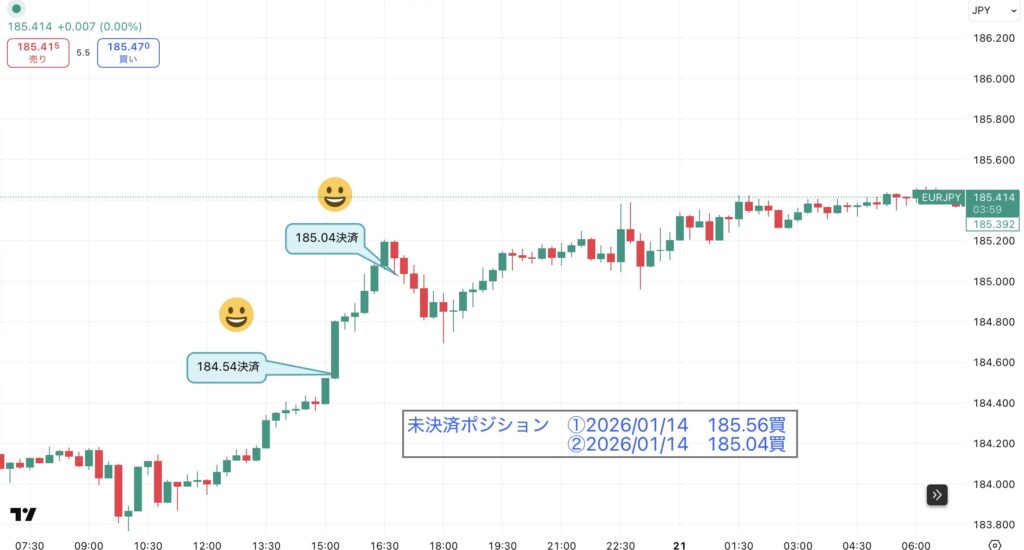 ユーロ円は「右肩上がり」でした!ピンクの線(150SMA)の上を綺麗に登ってくれている感じで、安心して見ていられました。「185.04円」と「184.54円」で決済マークがついています。こういう穏やかな日はいいですね!