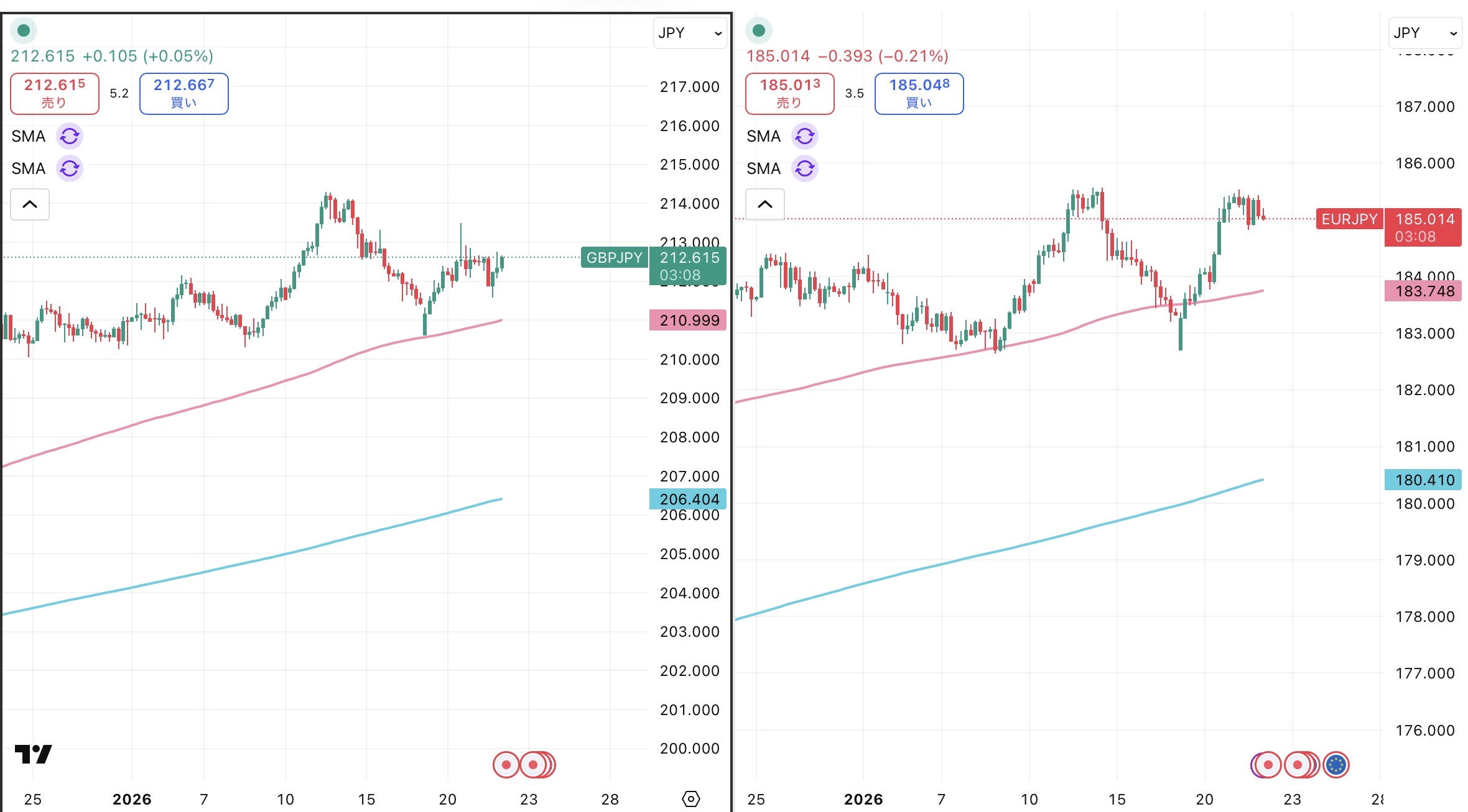 上のアイキャッチ画像のチャートは左がポンド円、右がユーロ円の4時間足です。「iサイクル2」トレンド判断テクニカルの150SMA(ピンクの線)、450SMA(水色の線)を反映させています。