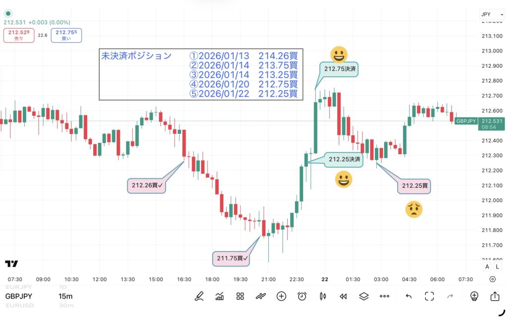 下のチャートは15分足で、1日のみ(7:00-翌日6:59)のものです。トレードがあったところにマークを付けました。ピンクの価格ラベルにチェック有りは決済された買い注文、チェックなしは未決済注文、青の価格ラベルは決済注文です。