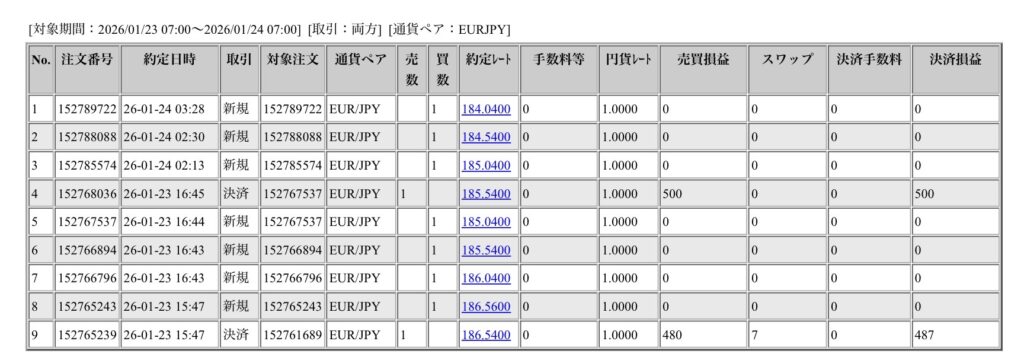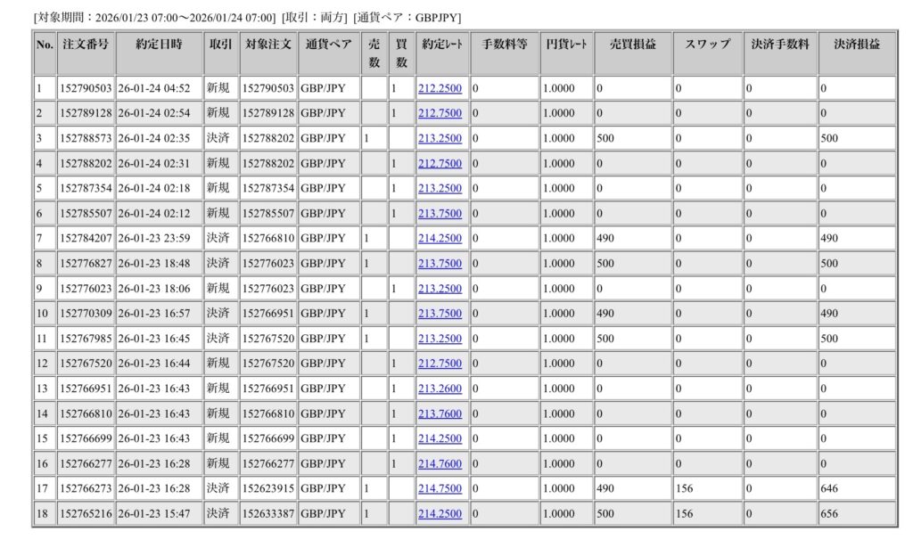 この日は「新規」取引がなんと18件!相場が激しく動いた分、システムも活発に働いてくれたようです。