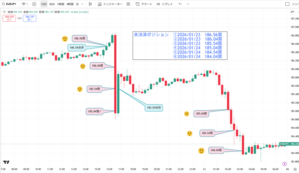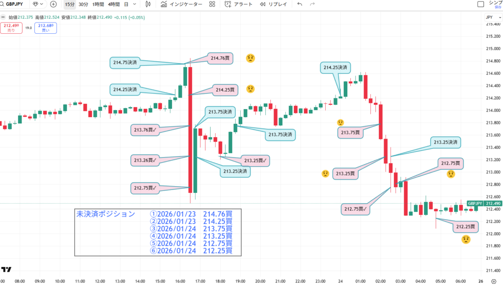 15分足チャート(下の画像)を見ると、特に夕方にかけての動きが激しかったのがわかります。iサイクル2のようなリピート系注文は、こういった乱高下でコツコツ利益を拾ってくれるのが強みですが、一方で急激に下がると「買いポジション」の含み損も一気に膨らんでしまいますね……。