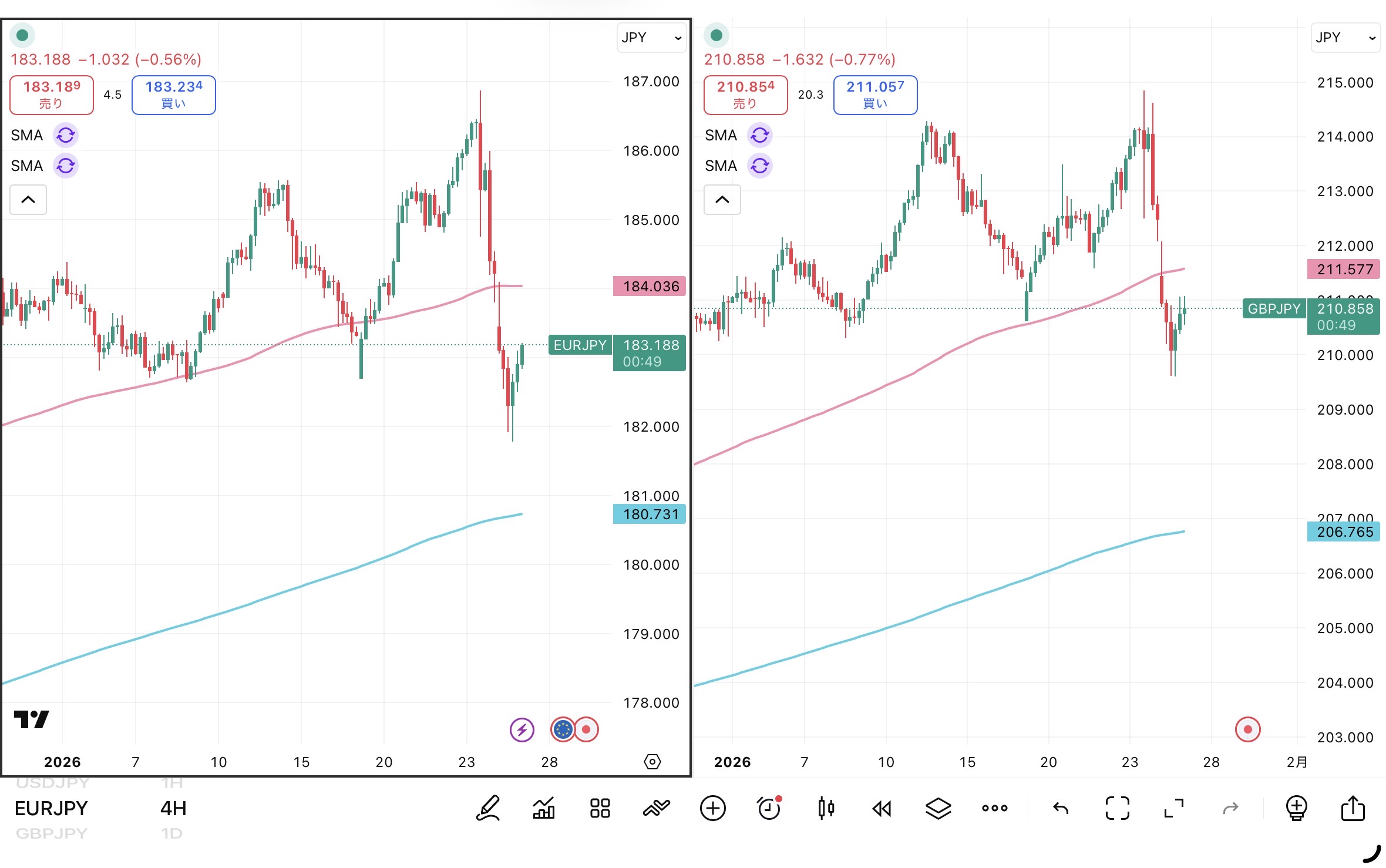 上のアイキャッチ画像のチャートは左がユーロ円、右がポンド円の4時間足です。「iサイクル2」トレンド判断テクニカルの150SMA(ピンクの線)、450SMA(水色の線)を反映させています。