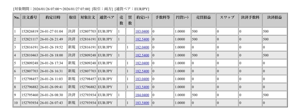 両方のペアで合計9回の決済(利食い)がありました。相場が下がっていく中でも、少し反発したタイミングを逃さずに利益に変えてくれるのがこのシステムの頼もしいところです!