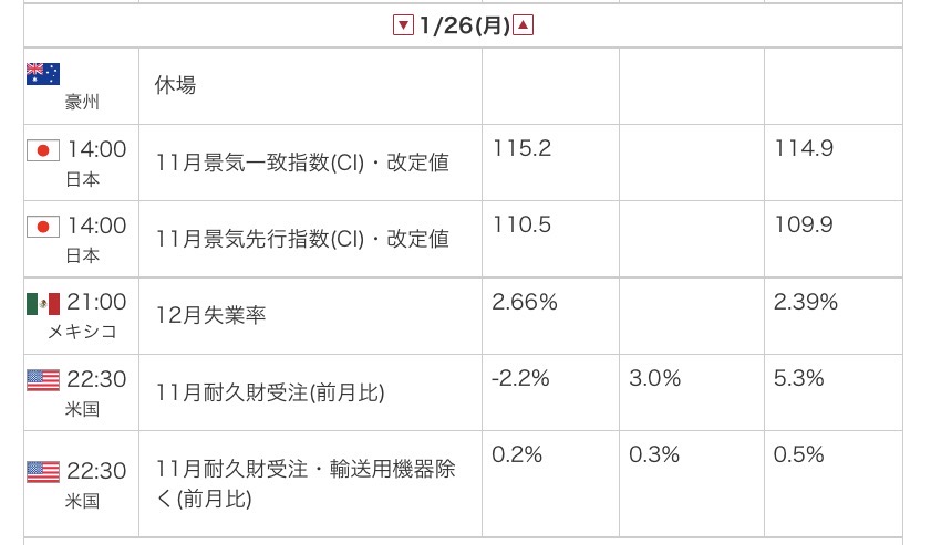 2026年1月26日(月)のカレンダー*外為オンラインからの引用