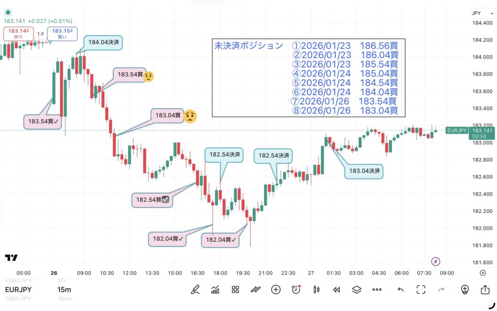 価格が下がったので、ピンクのラベル(買い注文)がたくさん増えました(ユーロ円8件、ポンド円9件)。一方で、下落トレンドの中にも細かな上下の動きがあるので、そこでしっかり青いラベル(決済)が発生して利益になっています。