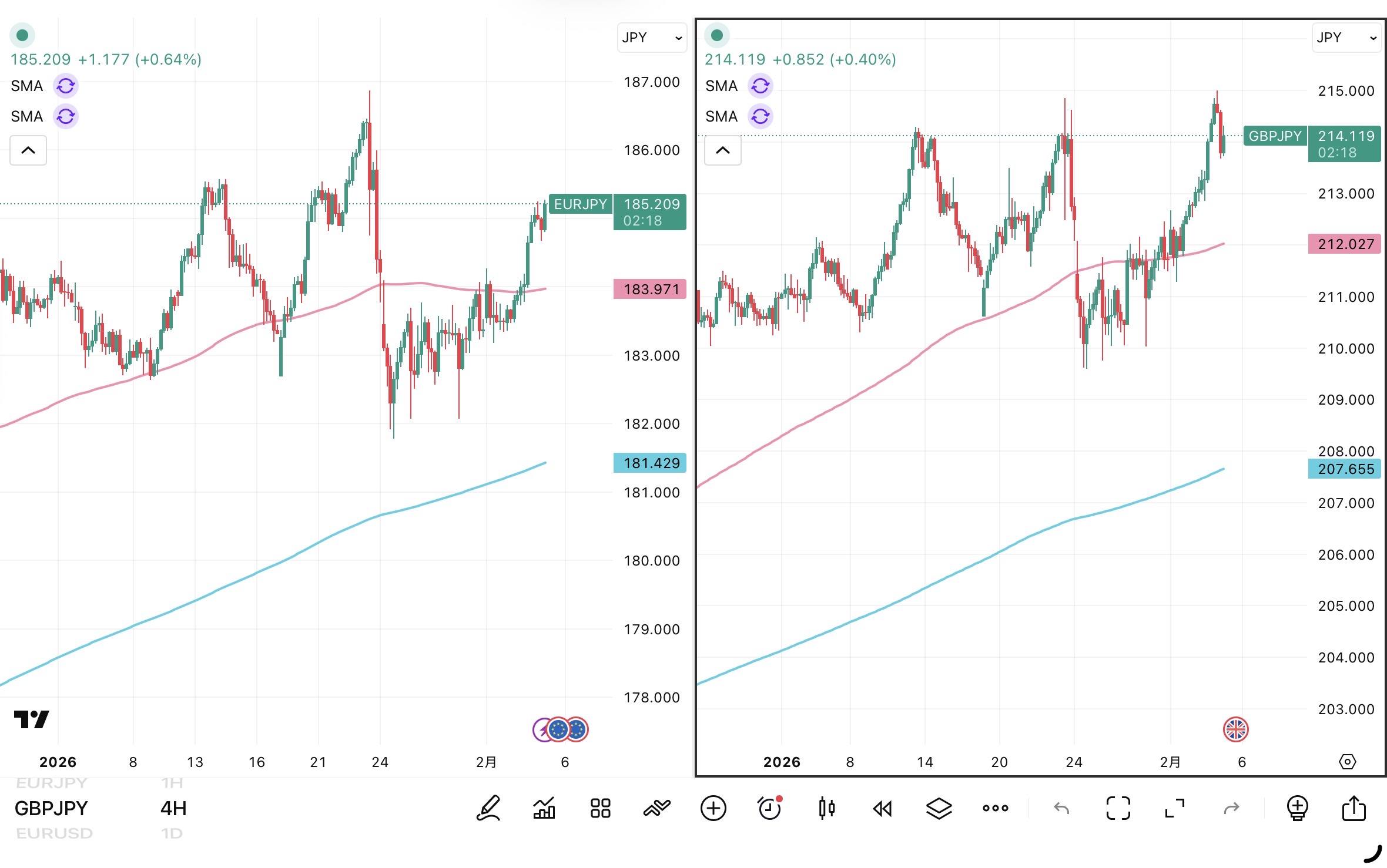 上のアイキャッチ画像のチャートは左がユーロ円、右がポンド円の4時間足です。「iサイクル2」トレンド判断テクニカルの150SMA(ピンクの線)、450SMA(水色の線)を反映させています。