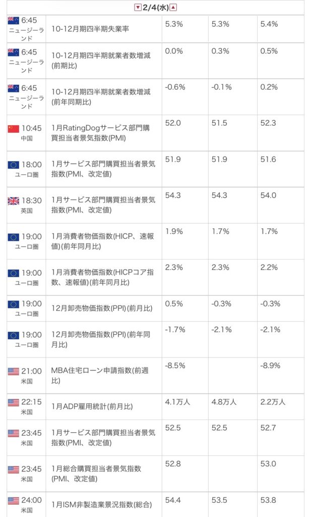 2026年2月4日(水)のカレンダー*外為オンラインからの引用