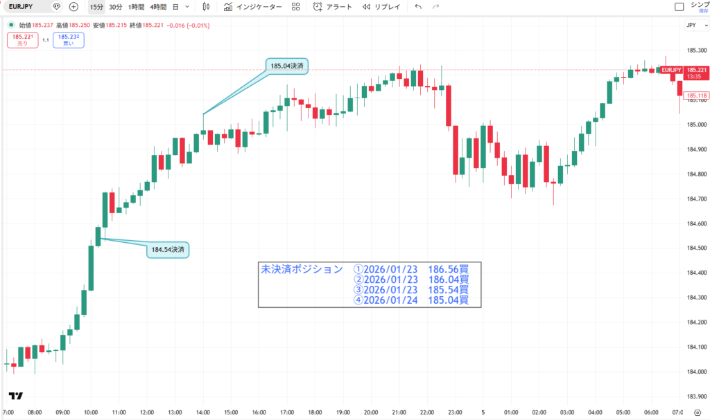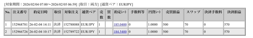 ユーロ円は大きな崩れもなく、堅調に推移しました。19時のユーロ圏消費者物価指数(HICP)は予想通りの落ち着きを見せましたが、相場は底堅く、2件の決済となりました。