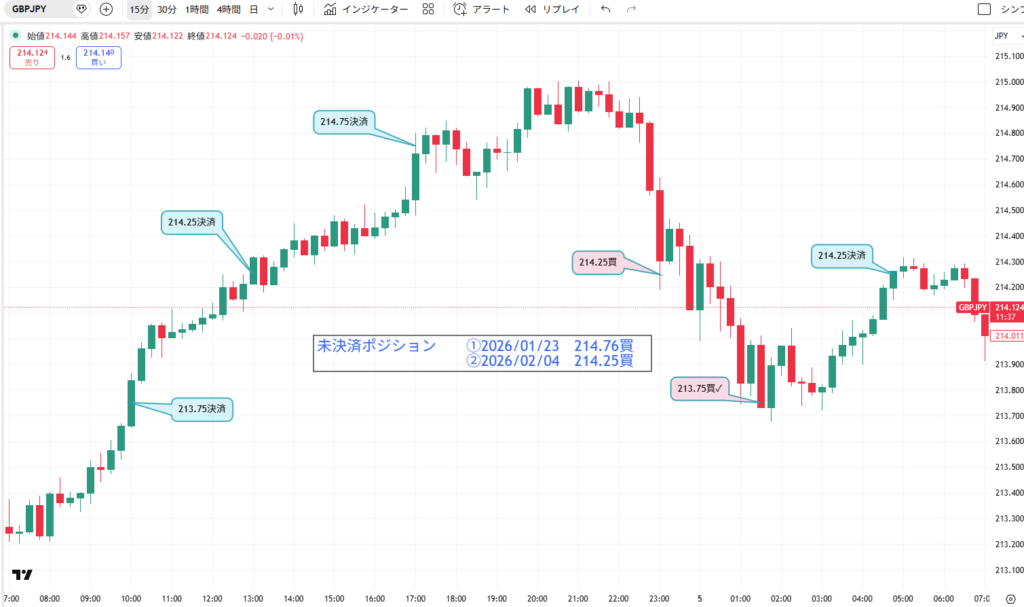 下のチャートは15分足で、1日のみ(7:00-翌日6:59)のものです。トレードがあったところにマークを付けました。ピンクの価格ラベルにチェック有りは決済された買い注文、チェックなしは未決済注文、青の価格ラベルは決済注文です。