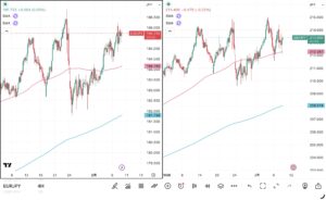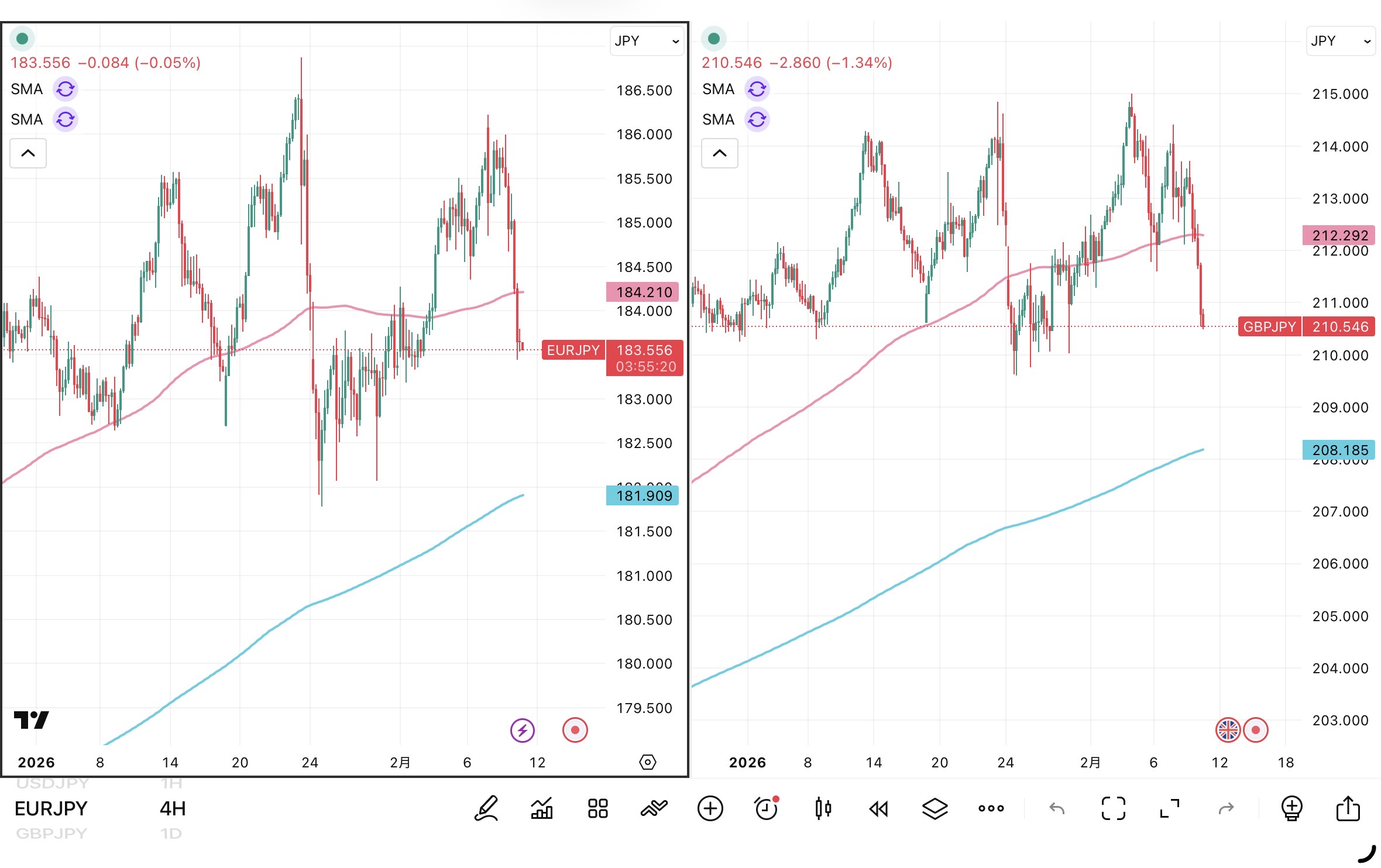 上のアイキャッチ画像のチャートは左がユーロ円、右がポンド円の4時間足です。「iサイクル2」トレンド判断テクニカルの150SMA(ピンクの線)、450SMA(水色の線)を反映させています。