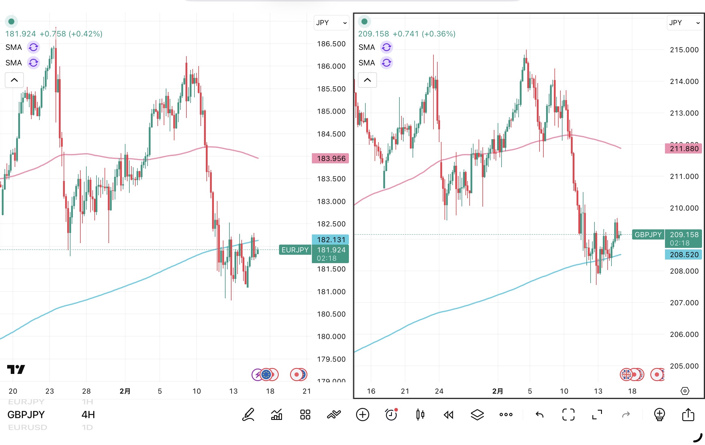 上のアイキャッチ画像のチャートは左がユーロ円、右がポンド円の4時間足です。「iサイクル2」トレンド判断テクニカルの150SMA(ピンクの線)、450SMA(水色の線)を反映させています。