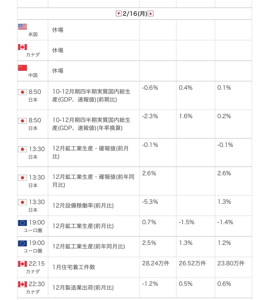 2026年2月16日(月)のカレンダー*外為オンラインからの引用