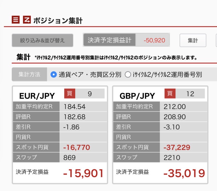 未決済ポジション一覧 ユーロ円9件、ポンド円12件ですね💦