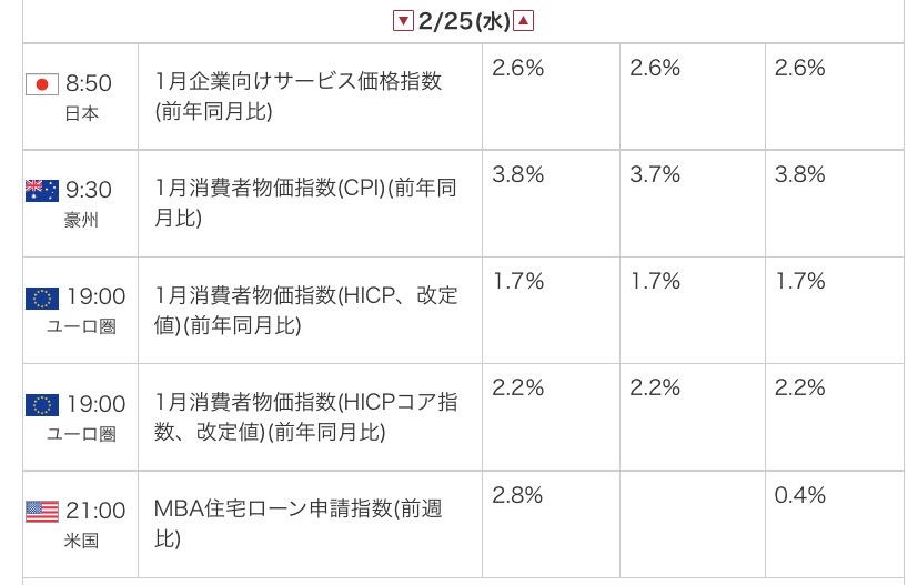 2026年2月25日(水)のカレンダー*外為オンラインからの引用