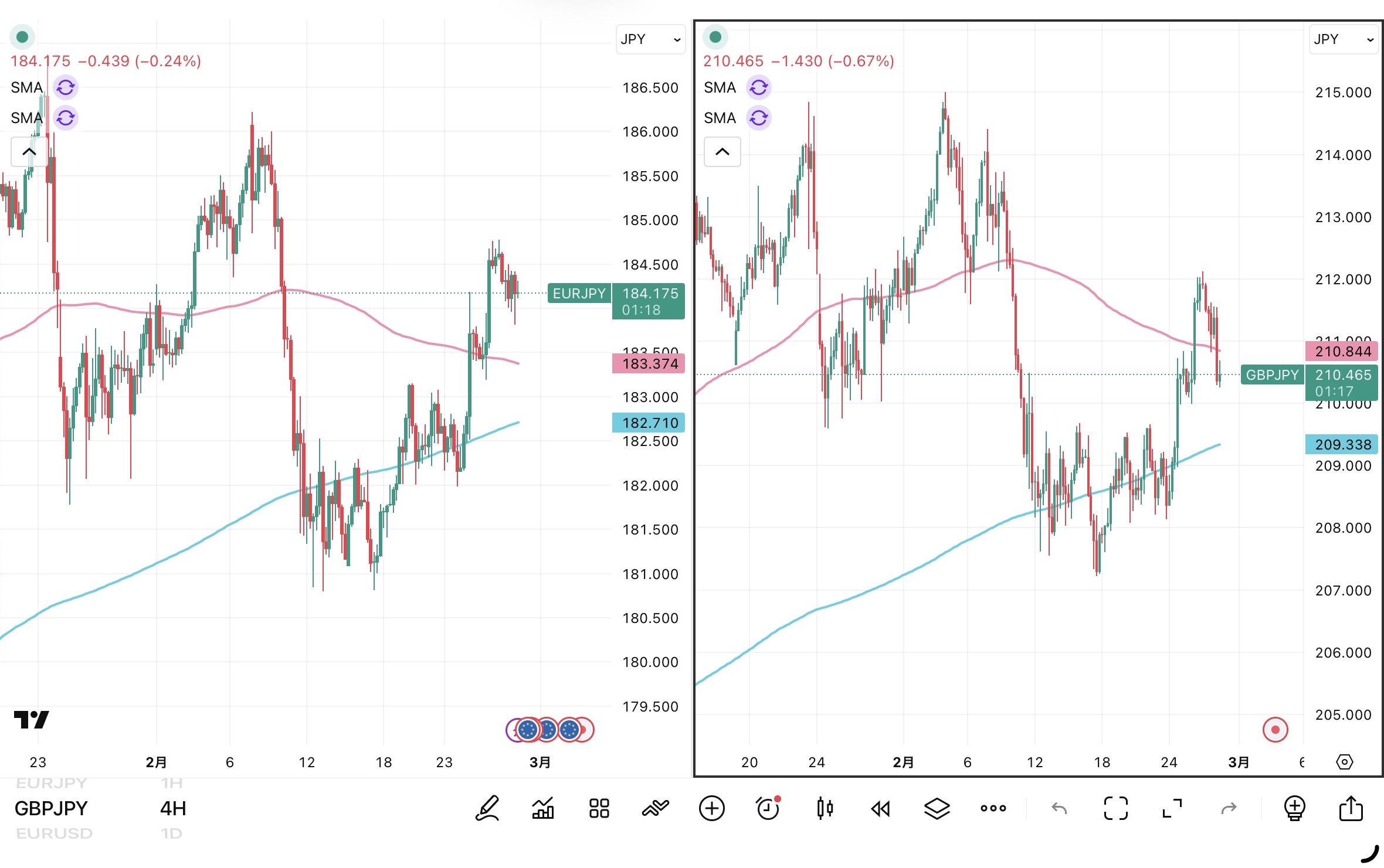 上のアイキャッチ画像のチャートは左がユーロ円、右がポンド円の4時間足です。「iサイクル2」トレンド判断テクニカルの150SMA(ピンクの線)、450SMA(水色の線)を反映させています。