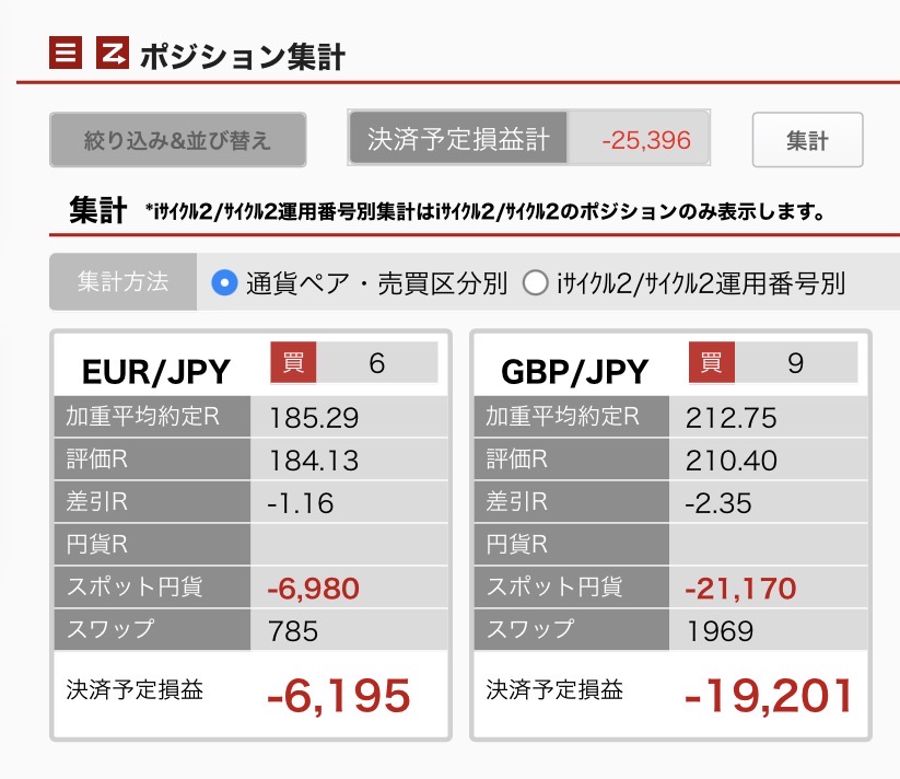 未決済ポジションや利益と含み損益の数字が合わないのは、以前のポジションが決済されず残っているからです。