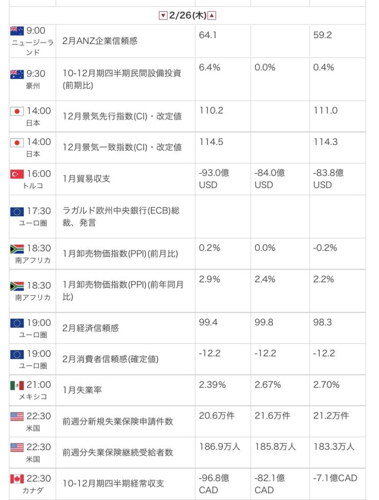 2026年2月26日(木)のカレンダー*外為オンラインからの引用