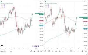 上のアイキャッチ画像のチャートは左がユーロ円、右がポンド円の4時間足です。「iサイクル2」トレンド判断テクニカルの150SMA(ピンクの線)、450SMA(水色の線)を反映させています。